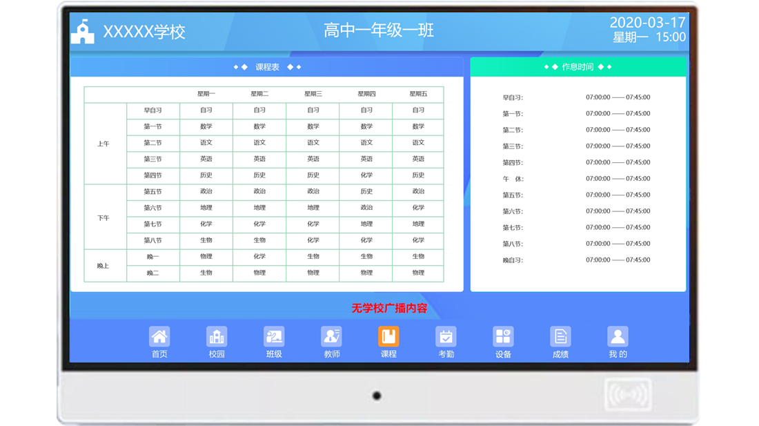 對所在班級的課程安排以及學(xué)校的作息時(shí)間的展示,讓師生合理安排時(shí)間,增強(qiáng)時(shí)間觀念。